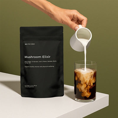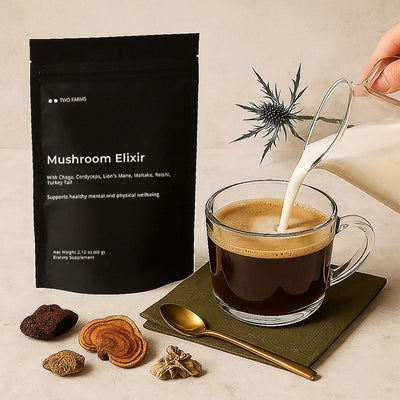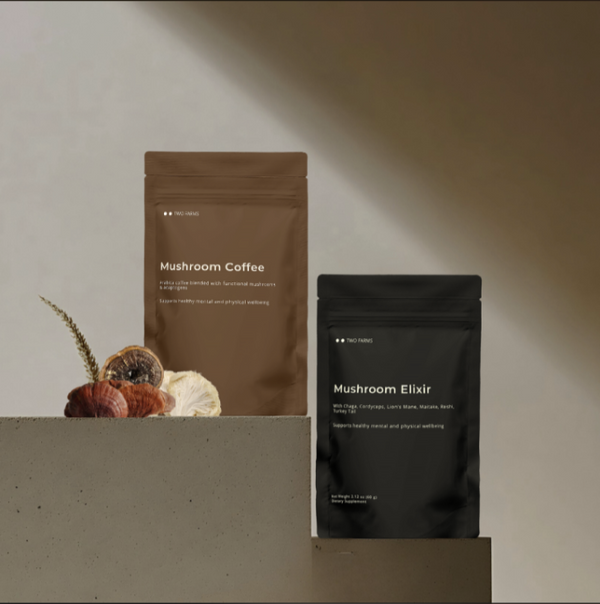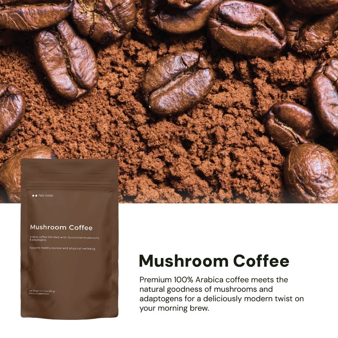 Two Farms uses real fruiting-body extracts and clean, low-acidity coffee.